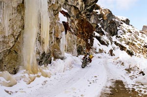 From Grdptsang Tso the road breaks up into a track and after a few steep stretches comes Y-Junction, 3 Kms from the lake. It's called Y-Junction because the road intersection is in the shape of a Y. A straight from Y- Junction will take you to Sangesar Lake also known as Madhuri Lake and the small turn on the right will take you to Bum-la. A board at Y-Junction said "Celestial paradise begins here". For me it began before P.T. Tso lake and also for the fact that this time around due to sub zero temperatures, I had not encountered any tourist vehicles, where tourist would rush out from the car with the camera, go click click click, on the lake or the board and without any hesitation come up to you wearing 3 jackets, two monkey caps and two pairs of gloves and ask you what the hell you were doing on a motorcycle and go back to the car and start murmuring to others who in turn would stare wide-eyed at you.
