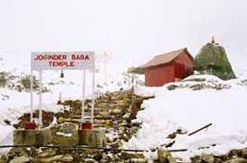 500 meters from this post comes a small structure on the left hand side of the road. It's the temple of Joginder Baba, Param Vir Chakra, posthumously. The temple is built to pay homage to the great soldier who fought bravely against the advancing Chinese Army with a handful of men and limited ammunition and no rations. Nobody lives at the temple, one can enter the shrine but first out of respect the footwear has to be removed. Don't worry about the cold because once you push the shrine gate open, a picture of Joginder Singh, commander of a platoon of Sikh Regiment stares right at you. It's like coming face to face with history. On the right hand side a board is placed which reads out the History of 1962 war and how Joginder Singh and his men became martyr giving the supreme sacrifice for the motherland.
