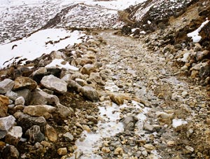 The climb is not just a climb but "The Climb". It is as arrogant as engineering can get. What makes it even more difficult is the surface; it's not smooth but instead has lot of loose stones and boulders which are a result of heavy Army vehicles revving up before the climb; it is not possible to gain momentum before the climb, lack of oxygen makes the bike also underperform by 50-70 % One just has to get down and push the bike up. A small stream runs down beneath the stones on the incline. The snow from the pass melts and makes its way through this artificial slope and into the lakes below.
