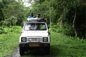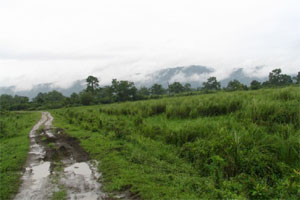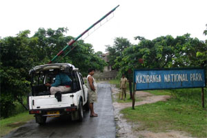 Welcome back ... This is your pilot-rider Praveen Rao, taking you on another flight. Today’s would be a low-altitude flight, skimming and brushing Elephant grass, as we maneuver the glider for a vantage view of our three riders entering the Kaziranga National Park, through the gates, on a Maruti Gypsy, chauffeured by the very efficient home keeper cum guide cum driver cum President of the Gypsy Owners Association of Kaziranga - Punen Gogoi.