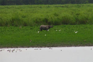 The gamble paid off to an extent. Within a couple of kilometers of entering the park the second time, Satish pointed next to the road in the Elephant grass. It was there only for a few seconds. But there it was ... a fully grown one horned Rhino, right next to us (within spitting distance). Too shy for a photo op, it scooted out of sight immediately.