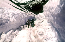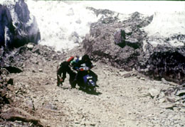 After the road to Rohtang was cleared, they rode on to Khoksar where they stayed for the night. The next day they started off towards Leh. They hardly rode some distance before they faced roads full of snow and heavy tourist traffic coming from the opposite direction. The scooter, with its variator transmission, could hardly make it along the steep inclines in such stop-go conditions; so the rider had to get off and push the bike to gather momentum and then jump on.