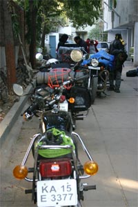 By the time we finished dumping all their bags, Bullets were sounding outside again. This time it was the Hyderabad gang. All the faces were known to me except Meher, Manjunath and Lakshmi. I had met Ajay, GR and Seshu during the Belum ride that Sanju and I had done with our local Bangalore crowd. Their bags were unloaded too. The room was overflowing with luggage. There was loud chattering as everybody updated their news - Ajay had a fall, there were some bike problems, they had stopped at Mandeep's house at Valsad and started very early in the morning. Mandeep... I smiled, our torch in Valsad who had taken care of the cranky out of fuel Titli - Valsad also reminded me of Sanju. Where was he? Long life the guy has, because he arrived right that very minute from Anand with Dhruv. Dhanno, he said, had some problems so he left as fast as he came with a few of the other Hyderabad people who were headed to a Bike repair place.